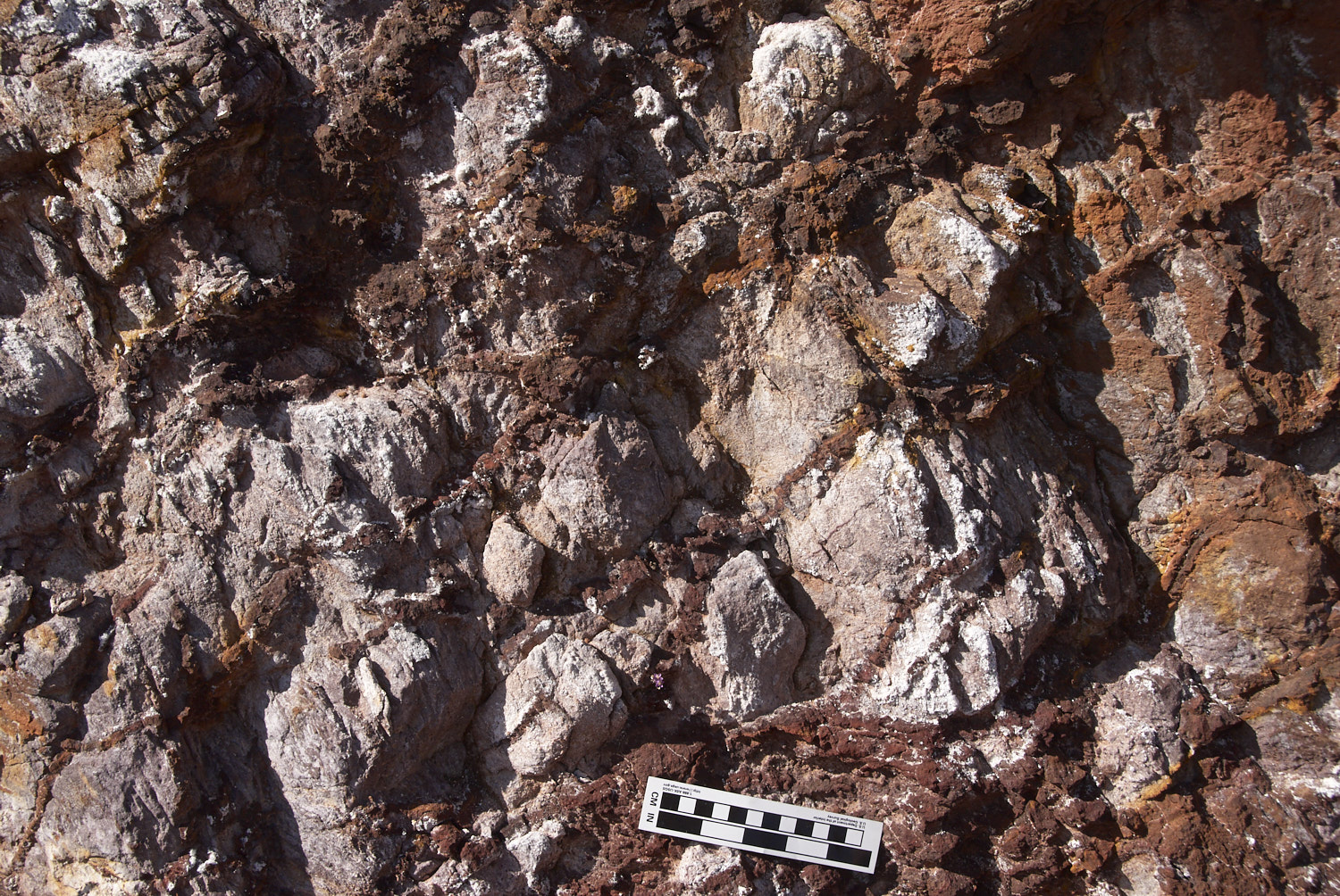 The São Domingos orebody (mined out) was composed of a single, subvertical, massive sulphide lenticular body, striking approximately E-W, about 537m along strike, and with a maximum thickness of 45m (Webb 1958, Carvalho 1971). The position of the orebody is within the top of a sequence composed of black shales and acid, basic and intermediate volcanics of the Volcanic-Sedimentary (VS) Complex of the Iberian Pyrite Belt. The orebody is rooted in a stockwork, well developed on the northern side of the open pit, characterised by a network of centimetric, anastomosing, pyrite-quartz veinlets (Matos et al. 2006, Oliveira et al. 2006, Matos et al. 2008, Pereira et al. 2008). The stockwork represents channelways of hydrothermal fluids responsible for the ores, which produced hydrothermal alteration with normal zonation (Barriga, 1990), with chlorite and quartz in proximal domains and sericite±quartz in more peripheral domains. The structural unit containing the VS Complex and the sulphide orebody is bound by overthrusts, with left-lateral displacement, which bring older (Upper Fammenian) rocks, of the Phyllite-Quartzite (PQ) Group, to a position above the VS Complex.