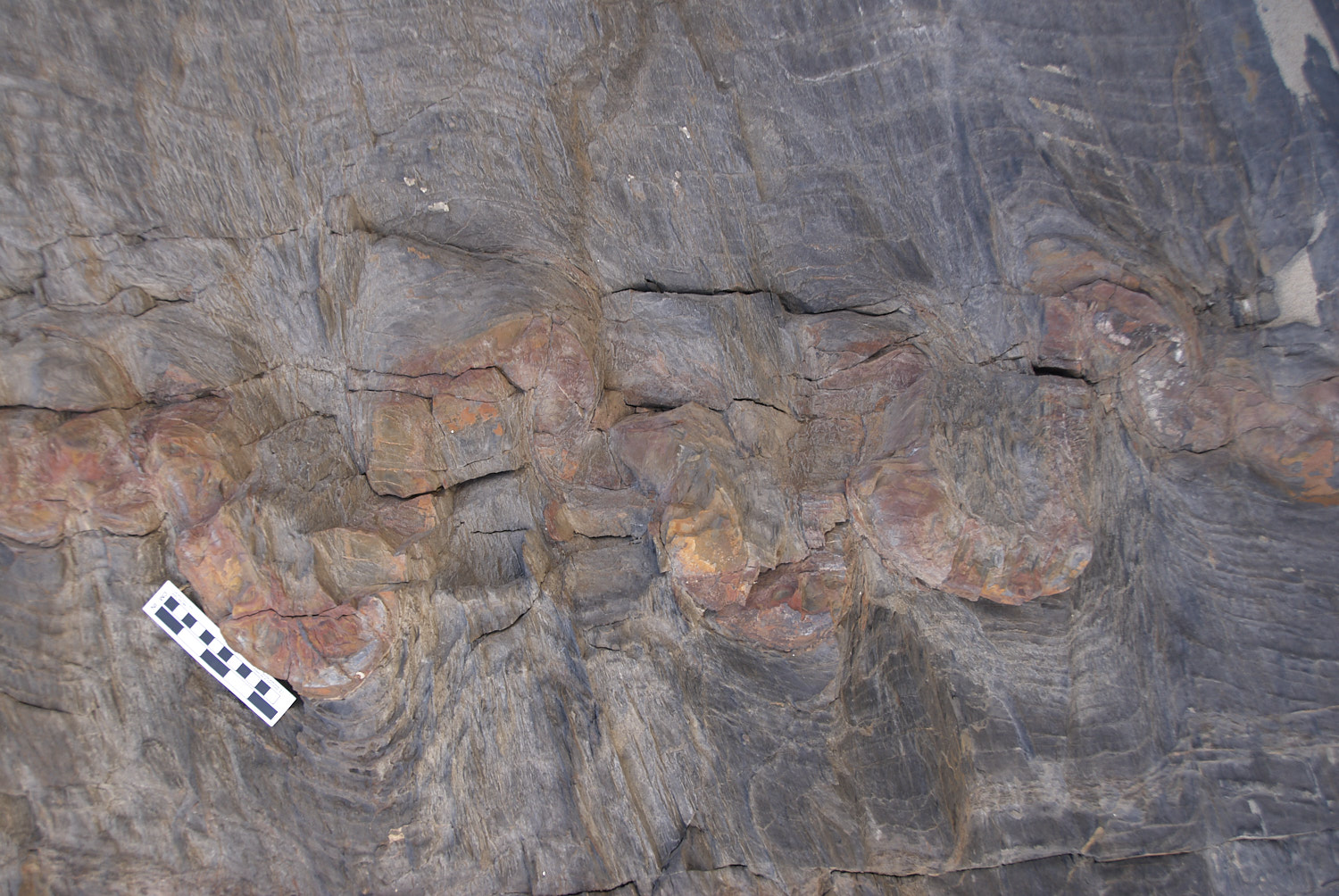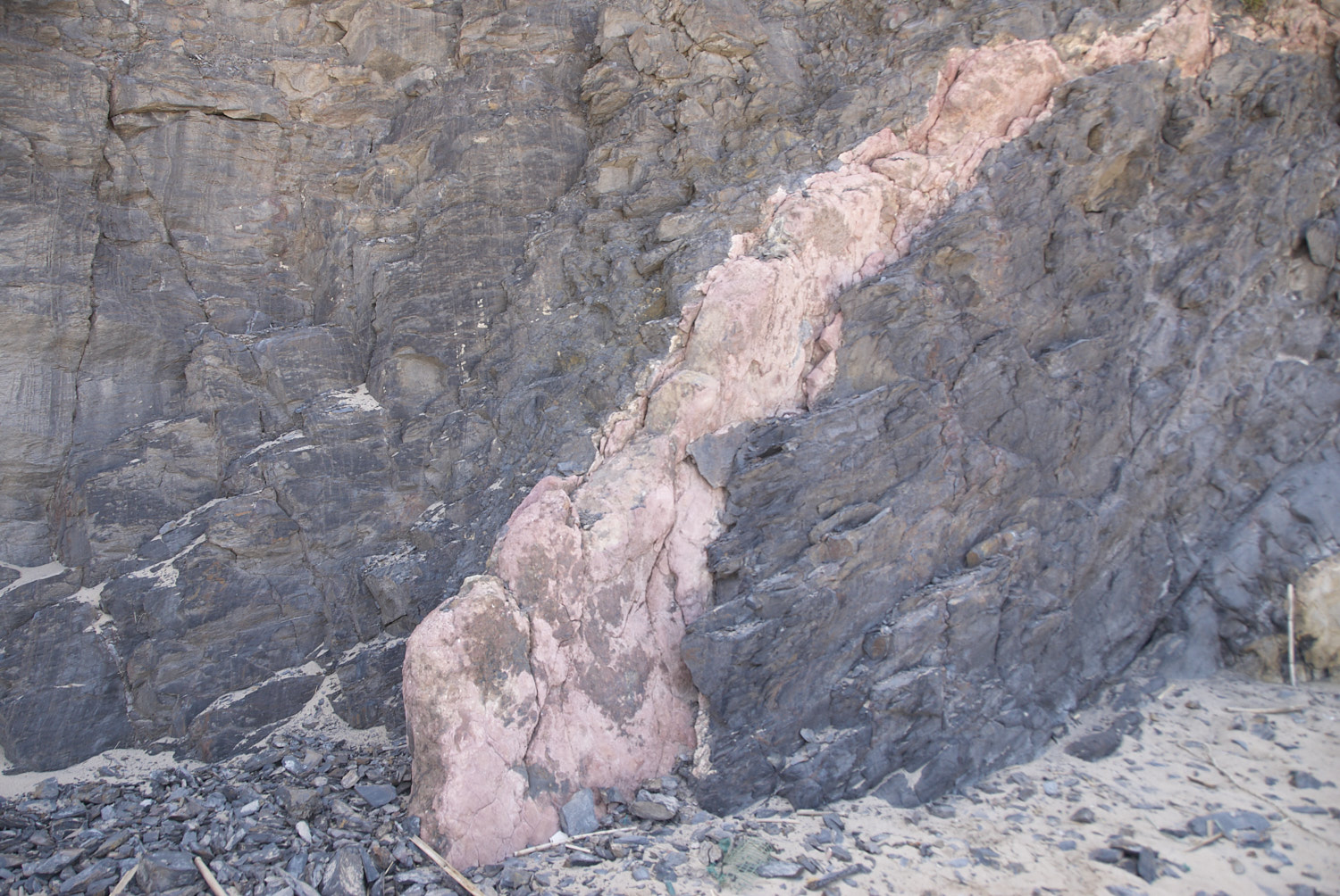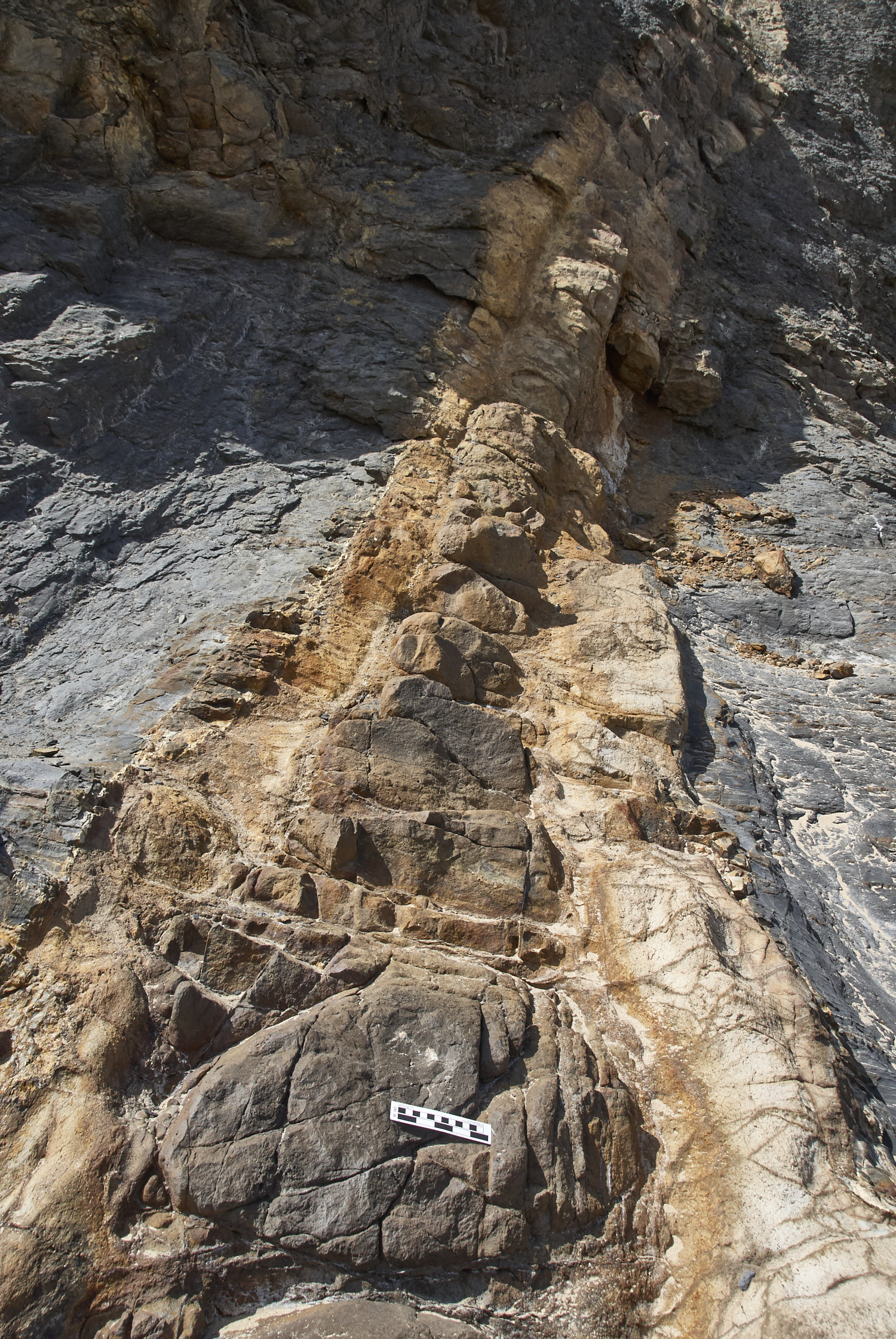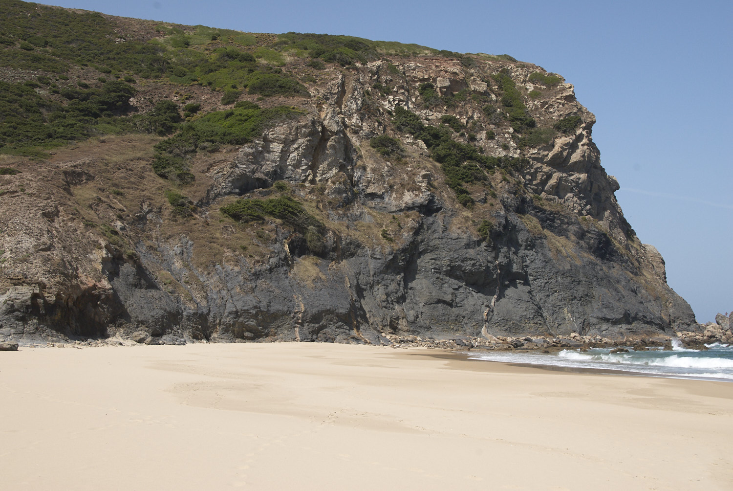desta rocha no seu interior. Tanto o dique dolerítico como os filões alcalinos são considerados do Jurássico Superior, contemporâneos da abertura do Oceano Atlântico ( Ribeiro et al., 1987). Para além da sequência estratigráfica, a arriba central desta praia evidencia vários aspectos interessantes de natureza estrutural. As unidades do Grupo da Carrapateira desenvolvem extensa dobra anticlinorial vergente para SO, a que se associa clivagem xistenta inclinada para NE. Na arriba da praia são visíveis dobras cujas dimensões variam de centimétricas a hectométricas, sempre afectadas pela clivagem xistenta evidenciando frequentemente geometria em leque em torno das charneiras das dobras menores. São ainda de assinalar as sombras de pressão, com fibras de quartzo associadas, que envolvem nódulos piritosos e pistas orgânicas, as quais estão relacionadas com a compressão varisca. Na parte superior da arriba nota-se um contacto anormal entre as litologias da Formação de Bordalete, em posição sub-vertical, e as litologias da Formação de Murração, também em posição vertical. O contacto anormal está sublinhado por uma falha, com preenchimento argiloso, que tem sido interpretada como o plano do carreamento da Carrapateira (Ribeiro, 1983). No lado NE da arriba nota-se que a falha define estrutura tipo duplex, que corta um filão básico alcalino. Este facto sugere que o plano do carreamento rejogou posteriormente ao Jurássico Superior. Esta interpretação foi recentemente questionada por Silva (1998) que admite ser aquela falha uma falha normal. Na face sul da arriba, para além de vários filões de rochas básicas, observa-se o contacto, aparentemente concordante, entre a Formação de Bordalete e a Formação de Murração. Ao longo deste contacto ocorrem filonetes de quartzo e calcite, sugerindo movimentação tectónica relacionada com o carreamento da Carrapateira, em estádio de amortecimento frontal, que acaba por se consumar mais para SO, no coração da dobra anticlinal. (Ribeiro, 1983).A Formação de Bordalete é expressão de uma transgressão marinha que se instalou sobre os sedimentos detríticos litorais da Formação de Tercenas, de idade Devónico Superior.