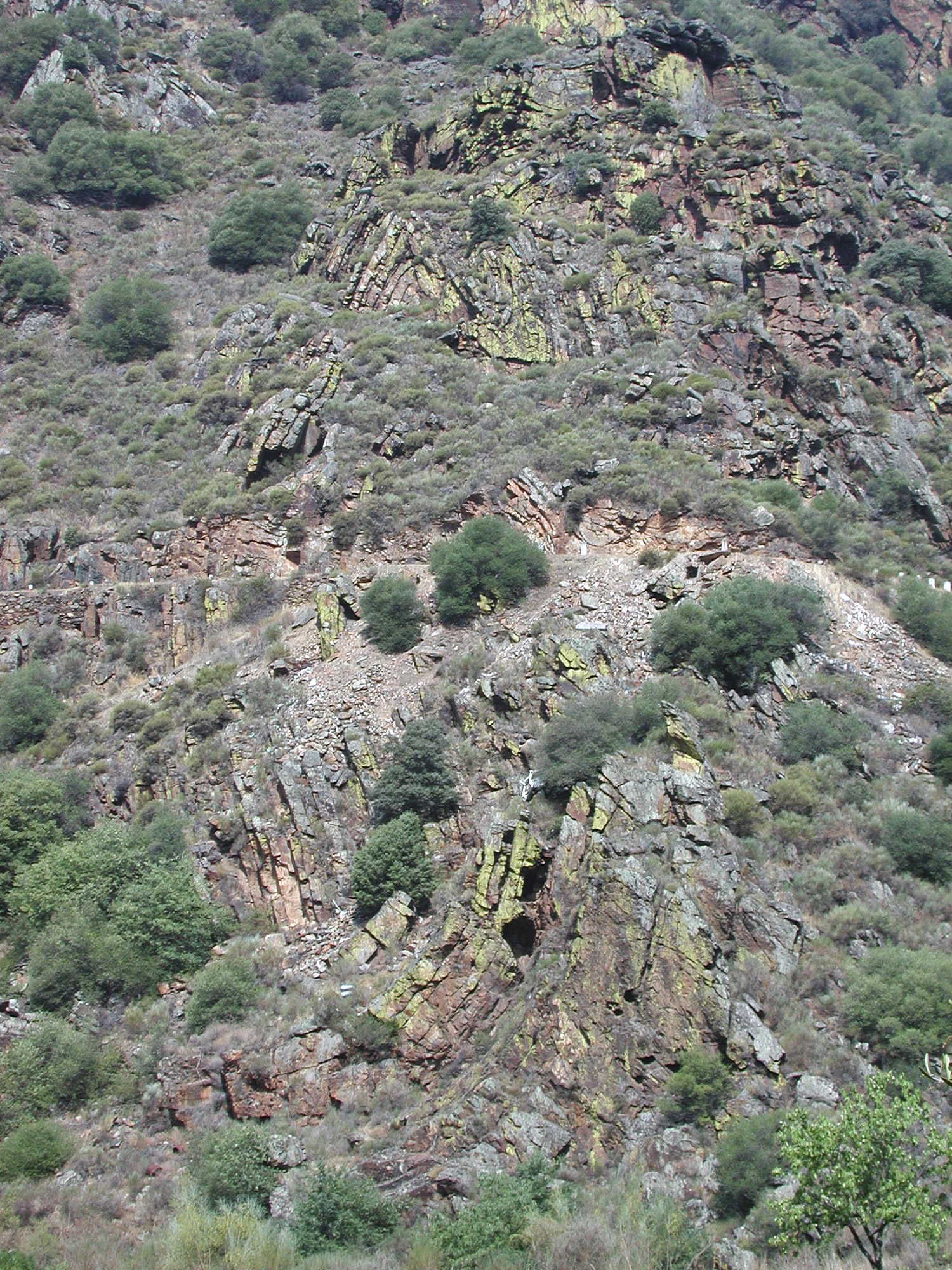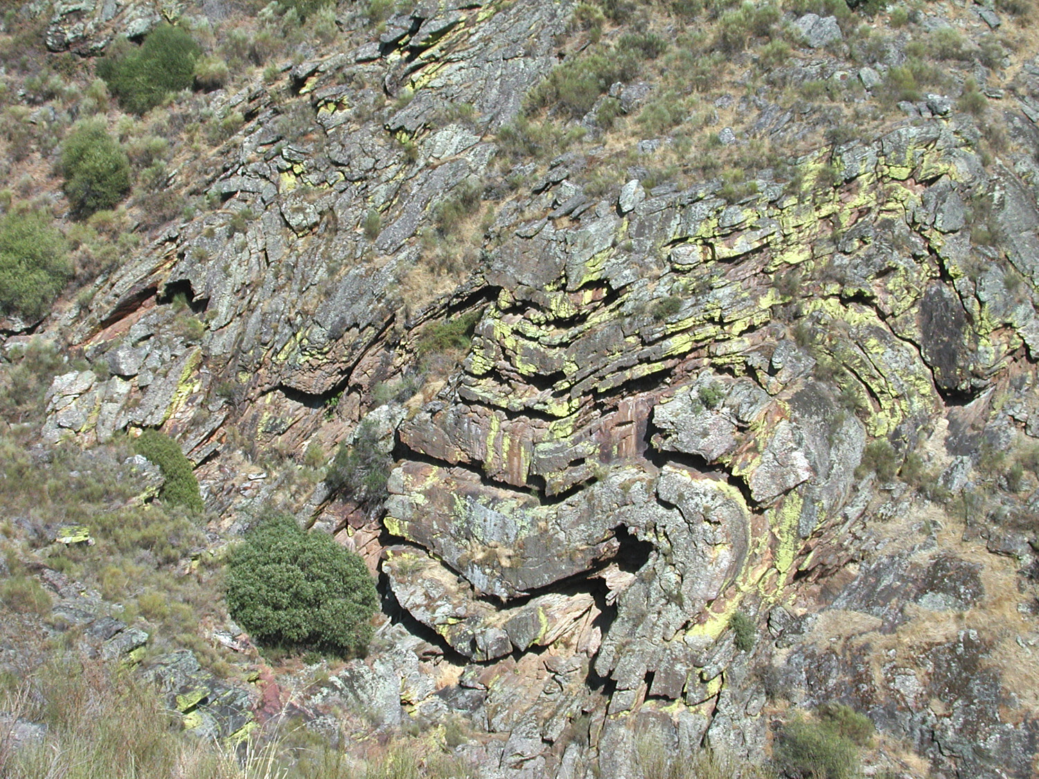 Conjunto patrimonial constituído por dobras com múltiplos padrões de dobramento, à escala micro, macro e mesoscópica, na sequência quartzítico do Membro Ermida (Formação Marão, Floiano – Ordovícico Inferior). No topo da sequência observa-se um estrato quartzítico verticalizado, com 5m de espessura e cerca de 20m de altura, localmente conhecido por Muro de Abalona.
